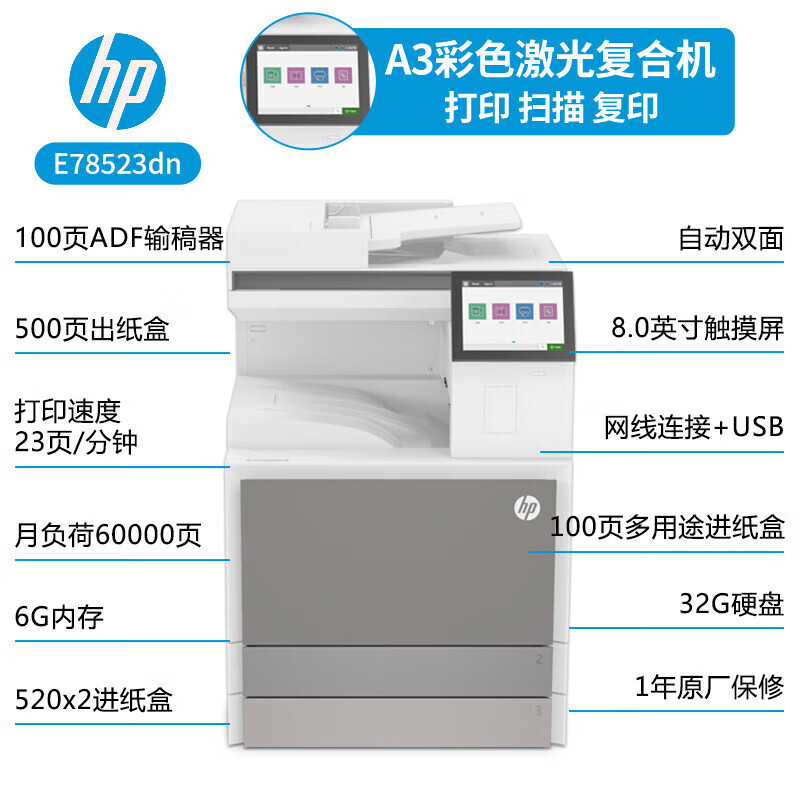 惠普(HP)打印机 78523dn/78528dn a3a4彩色激光双面网络复合机大型办公商用打印复印扫描一体机替78223dn E78523dn(新上代替78223dn)